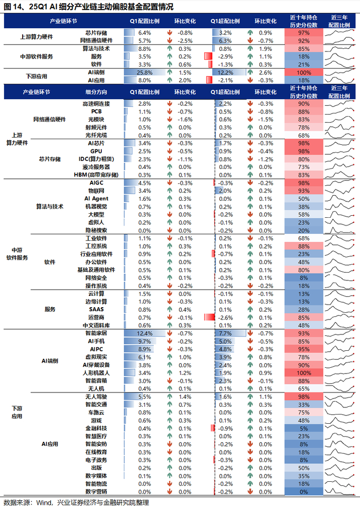 从2025Q1公募基金持仓变动看,AI中下游产业链多数细分方向迎来机构资金增配。资金共识看,中游AIAgent、物联网、工控系统、行业应用软件、基础及通用软件、SASS、语料库,下游无人驾驶、人形机器人、虚拟现实、智能交通、游戏等获增配比例相对居前。