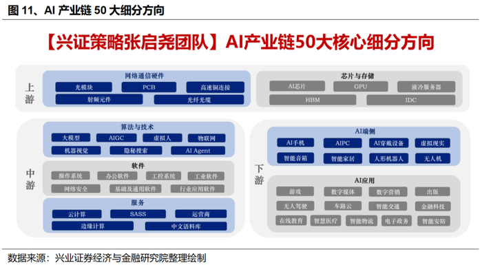 此外,从当前股价位置来看,年初以来涨幅落后、且仍未回补关税冲击以来缺口的方向包括上游光模块、高速铜连接、液冷服务器、HBM、GPU、PCB等,中游基础及通用软件、操作系统、大模型、网络安全、行业应用软件等,下游AI穿戴设备、AI手机、数字媒体、虚拟现实、出版、无人机等。