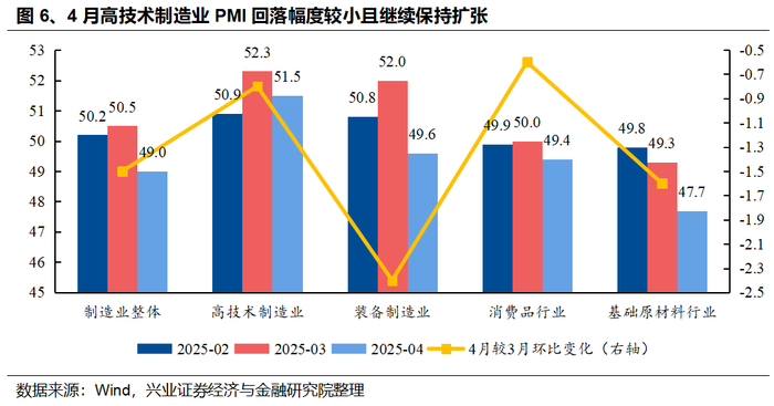 第二,外部环境急剧变化下,以科技为代表的高技术制造业或将是后续具备独立景气的领域。4月制造业PMI大幅回落,外部冲击的影响开始显现,但以科技为代表的高技术制造业PMI回落幅度较小且继续保持扩张。在经济高质量转型和AI产业趋势的加持下,科技或将是外部冲击下具备独立景气的领域。