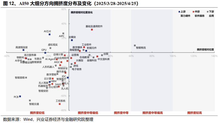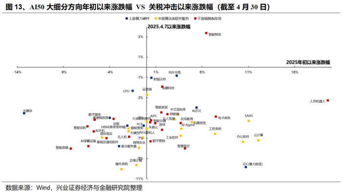 下游应用产业链中,25Q1业绩增速较高且相比24Q4改善居前的方向包括:数字营销、在线教育、车路云、金融科技、虚拟现实、人形机器人等。
