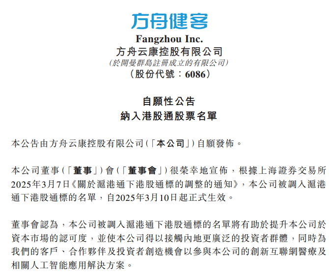 3月10日,方舟健客(06086.HK)因被纳入港股通标的名单,其股价一度飙升超过60%。