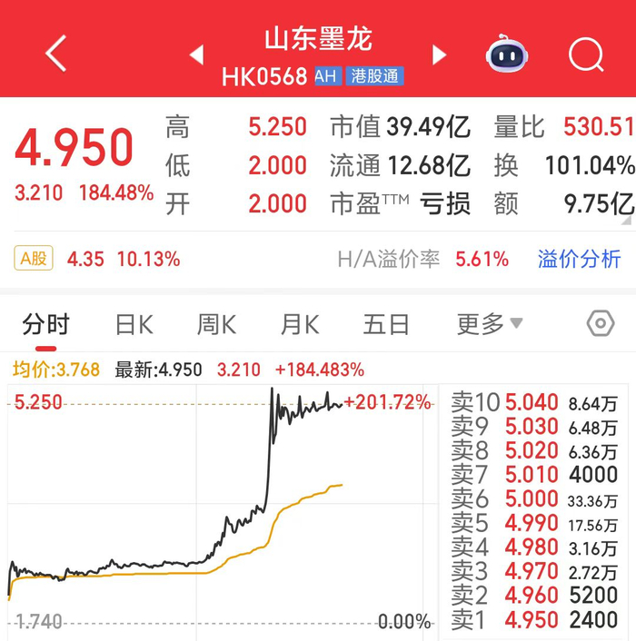 5月6日,山东墨龙(00568.HK)港股涨幅持续扩大,盘中一度涨超200%,最高报5.25港元/股。