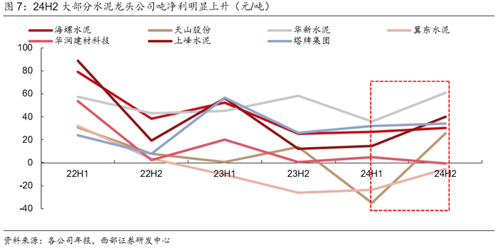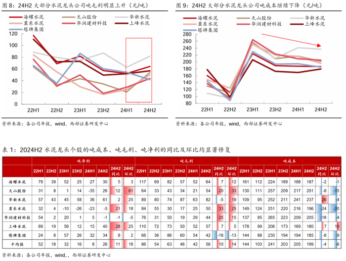● 从龙头个股的经营数据来看,24H2盈利拐点较为明显。从半年维度来看,24年下半年大部分龙头个股的水泥及熟料业务的单吨数据均明显改善,我们选取7家水泥行业龙头上市公司为样本,24H2样本公司水泥熟料业务的吨均价同/环比分别平均+6/+7元、吨成本同/环比分别平均-4/-6元、吨毛利同/环比平均分别+10/+14元,单吨价格上行、成本下降促进净利润提升,24H2吨净利的同/环比平均+11/+18元。