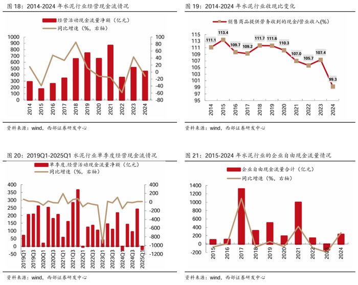 ● 24年、25Q1行业经营现金净额分别-11.5%、+11.6%,24年企业自由现金流大幅改善。水泥行业历年年度经营活动现金均为净流入,2024年经营现金净额同比减少11.5%至455.2亿元,主要因为收现比同比下降8.1pct至99.3%;25Q1行业经营活动现金净流出20.4亿元,净流出同比减少11.6%。从企业自由现金流量角度,2024年水泥行业的企业自由现金流量同比大幅增加368.8亿元至231.5亿元,由负转正。