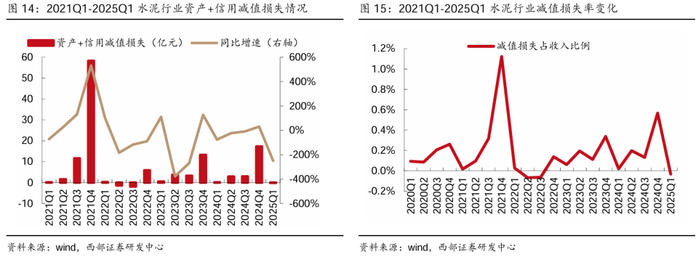 ● 24年、25Q1行业资产+信用减值损失分别同比+31%、 -249%。2024年水泥行业资产+信用减值损失同比增加31%至17.3亿元,占营业收入比重同比+0.23pct至0.57%。25Q1行业减值损失有所转回,同比减少249%至-0.2亿元,占收入比重同比-0.05pct至-0.03%。