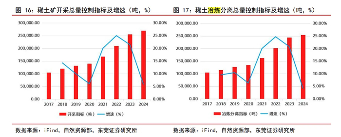 据东莞证券统计,国内方面,2024年全年稀土开采指标增加5.88%,2021年至2023年平均增速为22.14%;2024年冶炼分离指标更是仅增加4.16%,也远低于2021年至2023年21.80%的平均增速。