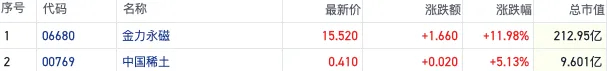 供给受限引发海外稀土价格跳涨 港股相关概念股走强金力永磁涨近12%