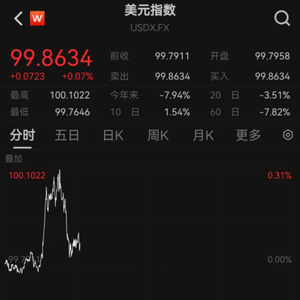 前一日,美元指数快速跳水,再度跌破100大关。亚洲货币普遍升值,离岸人民币一度升穿7.19创近半年以来新高。5月6日,美元指数拉升后回落,截至发稿,美元指数报99.8634,涨0.07%。