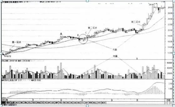 回调到B处,5日均线下穿10日均线,出现死叉。这好像是空头控制了局面,后市将一路下跌,但仔细观察发现,实际情况并非如此,因为这里的走势有几个显著特征: