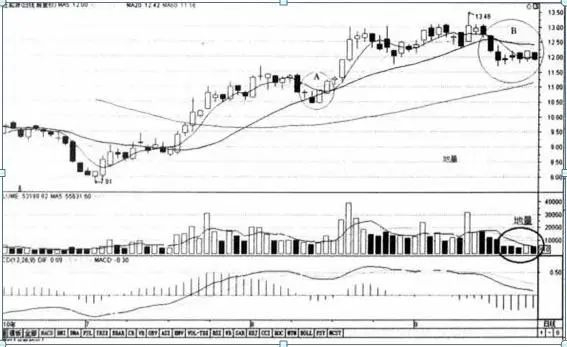 如果股市经过长期一轮下跌后企稳,此时庄家操纵股价开始小幅上升,成交量还在减少,意味着股市底部基本形成,空头态势转为多头态势指日可待,可以考虑建仓。如果股市经过长期一轮上升后不太稳定,此时股价继续上升,成交量开始减少,投资者要警惕股市可能由多头态势转为空头态势,最好提前平仓(图5-9)。