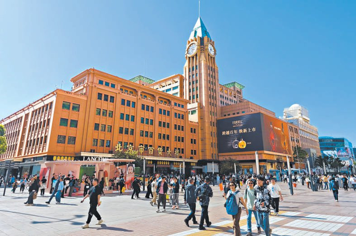 “五一”假期,在王府井步行街,市民游客感受传统商街魅力。