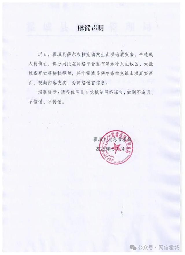 部分网民在网络平台传播所谓“洪水冲入主城区”“大批牲畜死亡”等视频,经核实,这些视频系通过拼接手段制作,并非霍城县萨尔布拉克镇山洪的真实画面。相关视频内容严重失实,属于谣言信息。