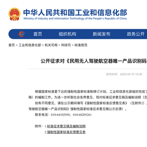《民用无人驾驶航空器唯一产品识别码(征求意见稿)》是由国家市场监督管理总局、国家标准化管理委员会发布的国家标准,规定了民用无人驾驶航空器整机唯一产品识别码的编码规则、登记备案、产品外包装标识、机体表面标识、存储与安全、广播与报送的相关要求,适用于微型、轻型、小型、中型和大型民用无人驾驶航空器整机的产品管理,不适用于模型航空器与自备动力系统的飞行玩具。实现“一码统管、无码禁飞”。