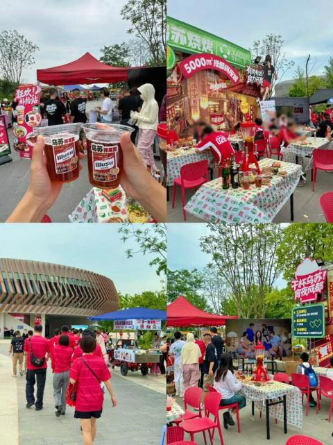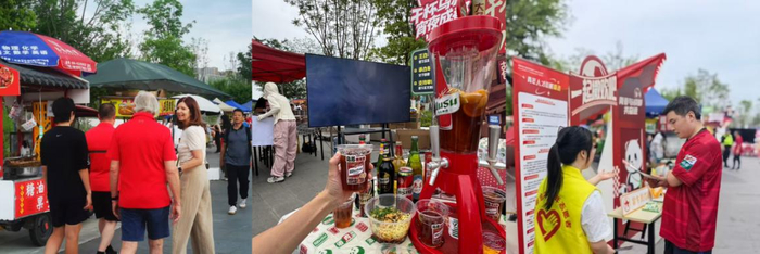 现场共设置四大主题片区,邀请乌苏烧烤在“赛事直播区域”搭建啤酒+夜宵快闪主题打卡装置,喜力啤酒在“特色商品展销区”提供特色饮品促销,康师傅在“游戏互动体验区”设置饮品及互动体验装置。此外,“游商活力走廊”涵盖多种丰富四川特色小吃、经典甜品、解暑饮料等,形成“观赛-消费-娱乐-社交”闭环动线,打造集观赛激情、消费、互动娱乐于一体的沉浸式体验空间。