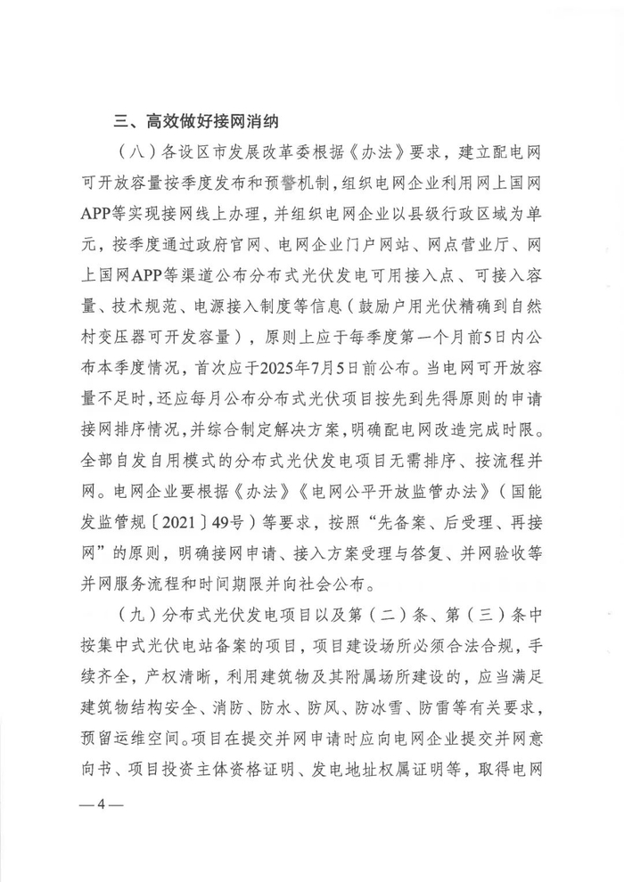 •为保障项目顺利落地,新政要求各设区市应建立配电网可开放容量发布和预警机制,通过线上办理接网、季度公布接入点信息等方式,提升透明度。电网企业遵循“先备案、后受理、再接网”原则,公开并网服务流程与时限,让企业办事更省心、更高效。