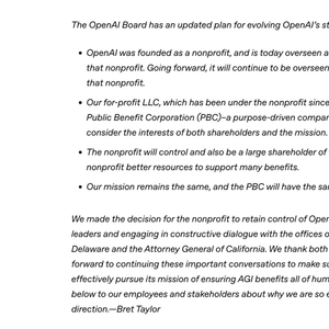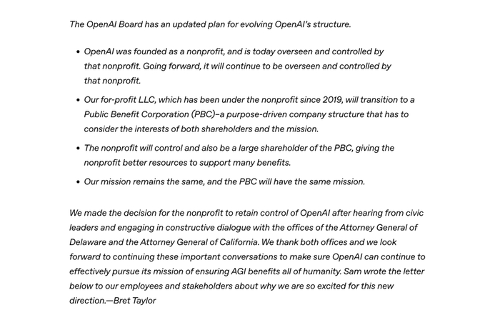泰勒表示,“在听取公民领袖意见并与特拉华州总检察长办公室及加利福尼亚州总检察长办公室进行建设性对话后,我们决定由非营利机构保留对OpenAI的控制权”,OpenAI的使命保持不变,PBC也将秉持同一使命。