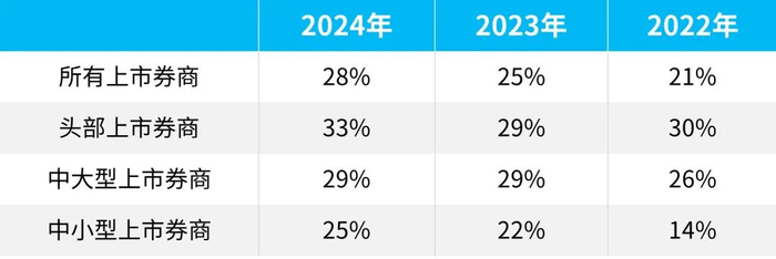 2024年上市券商平均净利润率为28%(详见表2),较2023年增长了3个百分点,结合对营收增长和归母净利润增长的分析,可以看出近年来上市券商降本增效措施初见成效。