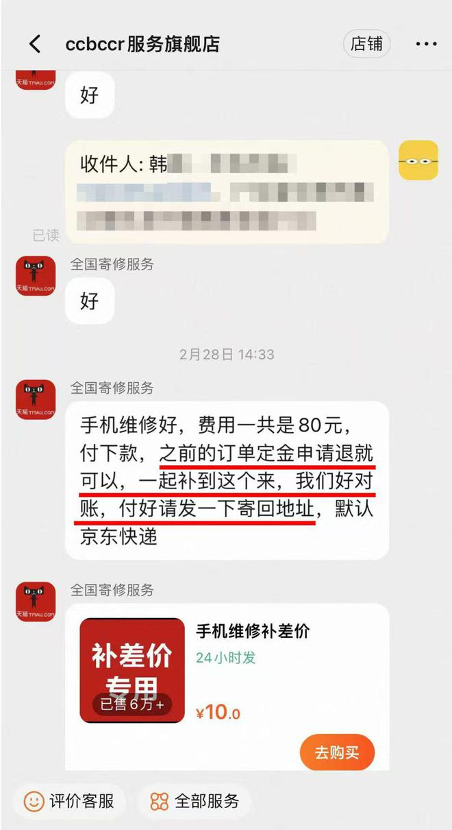 支付定金后,韩先生按照客服提供的地址将手机邮寄给商家,“2月28日商家收到手机维修后,通过平台给我发信息,说费用一共是80元,要求我把之前的订单申请退款,然后发给我一个新的‘手机维修补差价’链接,让我通过他发的链接补80元,说方便他们对账。”