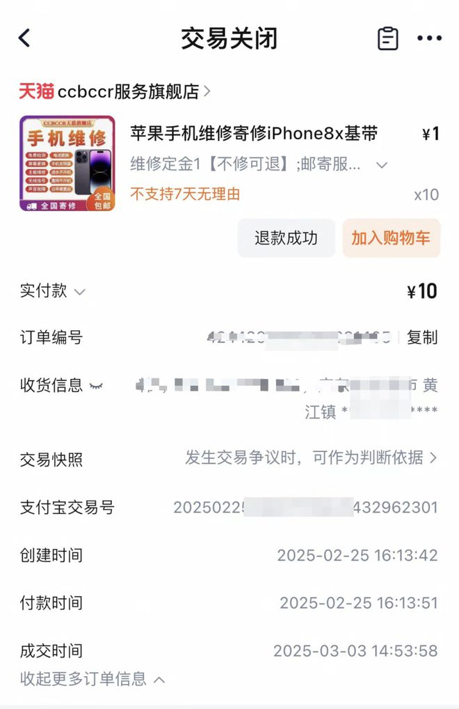 据韩先生介绍,由于其手机电池出现故障无法使用,2月25日,他通过淘宝平台的天猫“ccbccr服务旗舰店”下单了手机电池更换服务,并支付了10元定金,“当时我看到这家店是天猫旗舰店,而且销量比较大,没有差评,觉得比较可靠,就选择了这家。”
