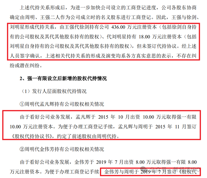 招股书称,由于看好探针卡行业的未来发展前景,部分具备入职意向的员工自公司创立之初即提出入股公司的诉求。具体看,由王强代徐剑持有公司 436万元注册资本(包括徐剑自身持有的公司股权及其代其他股东持有的股权)、代刘明星持有18 万元注册资本(包括刘明星自身持有的公司股权及其代其他股东持有的股权),但未签订代持协议。
