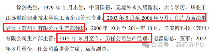 周明早年履历显示其2003年8月至2006年9月任库力索法半导体(苏州)有限公司生产主管;2006年10月至2014年3月任美博科技(苏州)有限公司生产部总监;2014年4月至2015年7月任法特迪精密科技(苏州)有限公司管理部总经理。