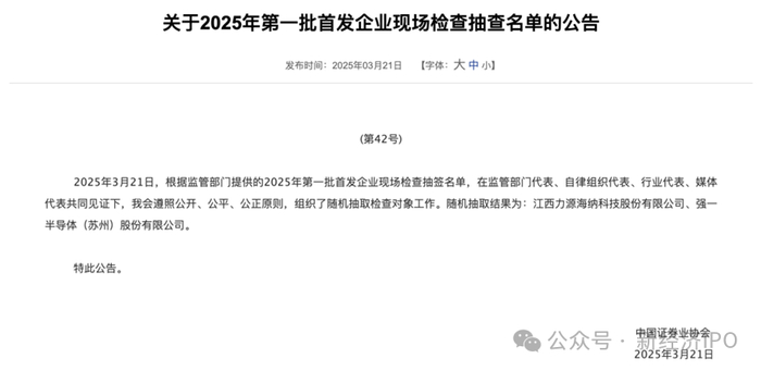 3月21日,中国证券业协会官网发布《关于2025年第一批首发企业现场检查抽查名单的公告》,随机抽取结果显示,江西力源海纳科技股份有限公司(简称“力源海纳”)、强一半导体(苏州)股份有限公司(简称“强一股份”)被抽中现场检查。