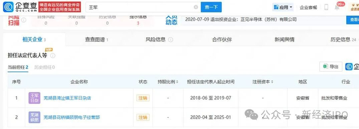 需要指出的是,根据长川科技披露信息以及强一半导体招股书,王军为王强弟弟,1979年出生,安徽芜湖人,他2018年-2020年曾先后注册过两家个体户,分别经营杂货和电子产品。王军曾在强一半导体中代哥哥王强持股,结合其履历信息看,他在法特迪担任法定代表人及持股大概率也是为王强代持。
