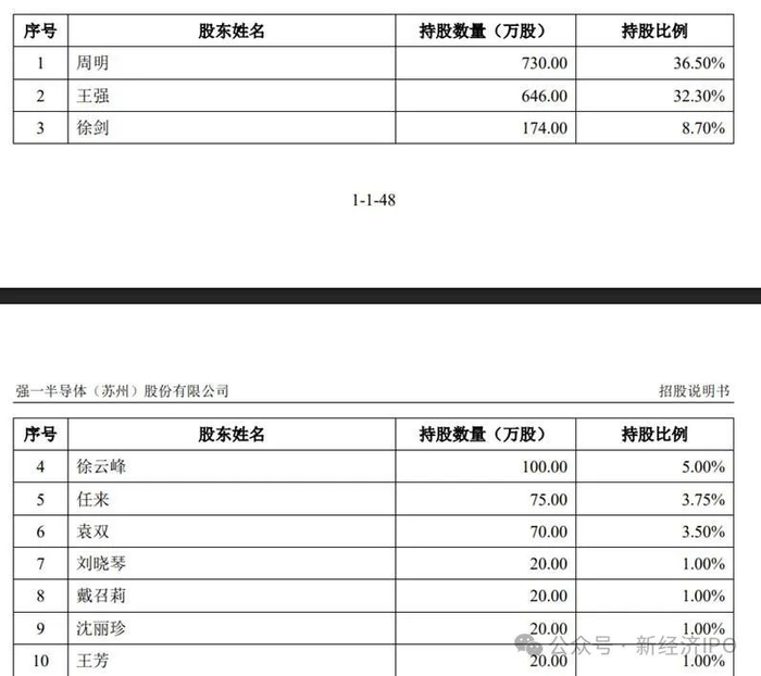 周明、王强、徐剑、刘明星自 2015 年下半年开始筹备创立强一半导体,各方拟定股权为周明持有注册资本730万元,持股36.5%;王强注册资本646万元,持股比例32.3%,徐剑注册资本174万元,持股8.7%。