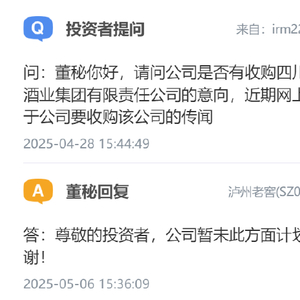 5月6日,泸州老窖在回答投资者提问时表示,暂未有收购四川仙潭酒业集团有限责任公司的意向。