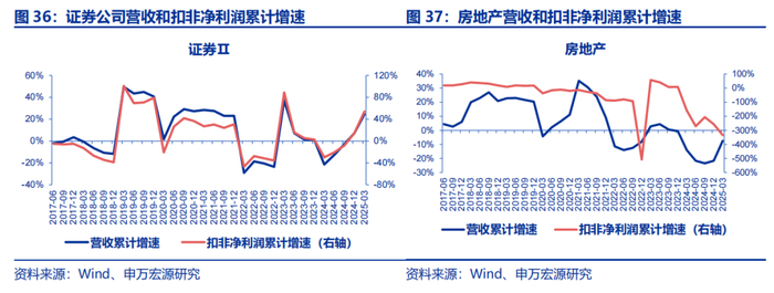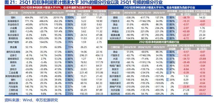 二级行业而言,筛选25Q1扣非净利润增速大于30%,且没有低基数效应的子行业主要有:塑料/装修装饰/房地产服务,贵金属/工业金属/小金属,通信设备/游戏/元件/影视院线,乘用车/汽车服务/工程机械/轨交设备/航海装备/摩托车及其他/其他电源设备/白色家电/贸易,农业综合/饲料,证券。而25Q1扣非净利润绝对值仍处于亏损的行业有:航空机场、光伏设备、房地产开发、地面兵装、体育、航天装备、焦炭、电视广播、软件开发、水泥、IT服务等。
