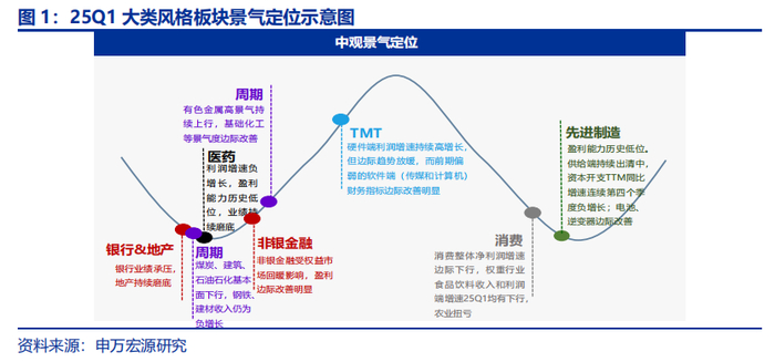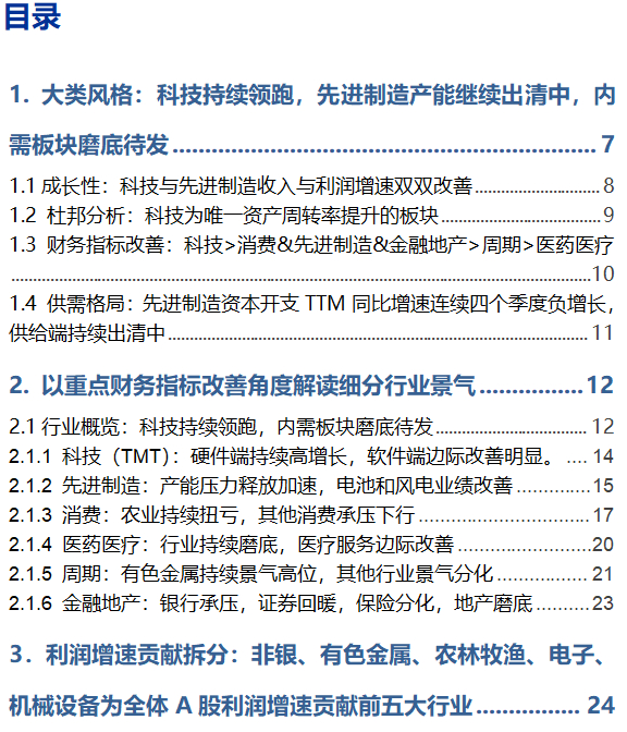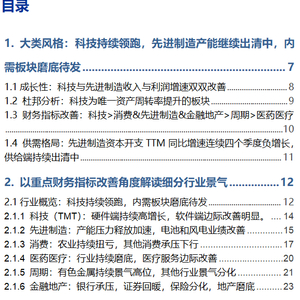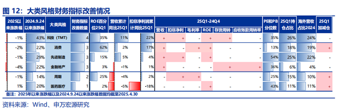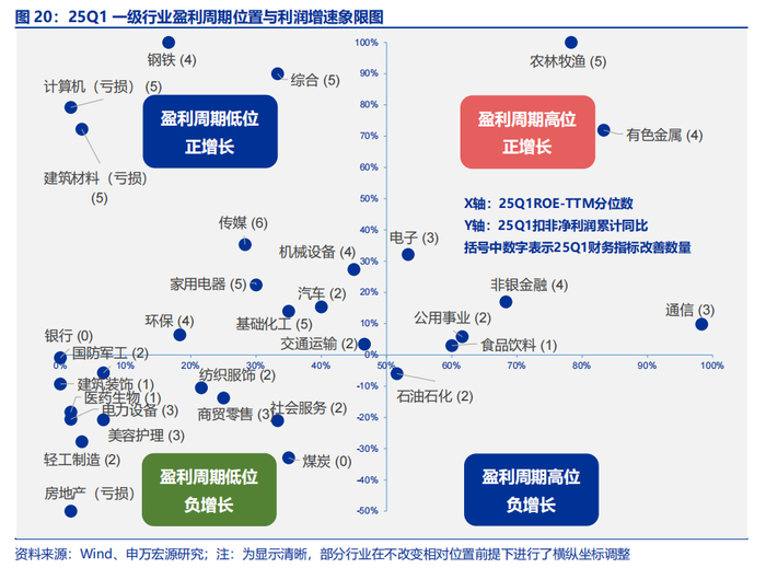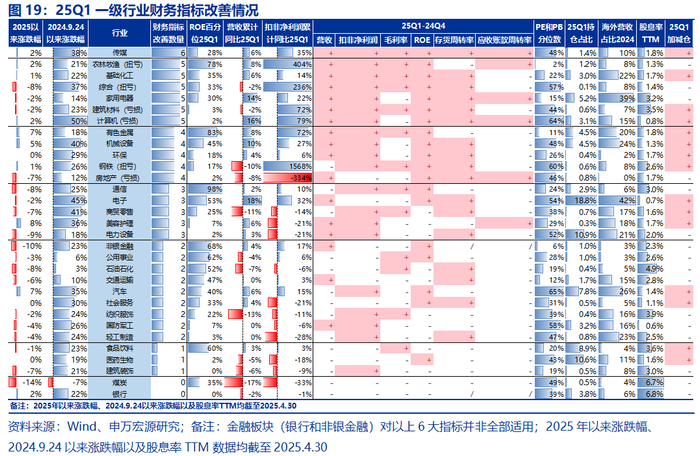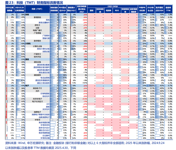 (1)科技(TMT):25Q1科技(TMT)整体表现延续良好增长态势,硬件端持续高增长,软件端边际改善明显。具体而言,25Q1财务指标改善数量在4个及以上的细分行业主要有:影视院线、游戏、出版、电视广播、计算机设备、IT服务、其他电子、元件、光学光电子、电子化学品。(2)消费:板块整体仍处于下行周期中。消费板块25Q1收入端仅实现2%的同比增速,利润端增速边际下行,结构上农林牧渔实现扭亏,业绩持续改善,而权重行业食品饮料25Q1仅改善1个财务指标,收入和利润增速双双回落。(3)先进制造:先进制造整体盈利能力处于历史低位,供给端持续出清中,板块资本开支TTM同比增速连续四个季度负增长,其中机械设备、环保、摩托车及其他以及电力设备中的风电设备、电机、电池、逆变器25Q1财务指标均改善在4个及以上。(4)金融地产:银行承压,证券回暖,保险分化,地产磨底。金融地产中主要是证券带来的业绩贡献,银行基本面承压,证券受权益市场回暖影响,盈利改善显著,保险在新会计准则下业绩分化明显,地产持续磨底。(5)周期:周期板块内部有所分化。其中有色金属延续高景气,基础化工边际改善,而煤炭、石油石化、公用事业和建筑装饰等基本面则压力较大,25Q1财务指标改善数量均在2个及以下。另外,钢铁和建材25Q1收入端为负增长。(6)医药:医药板块整体持续磨底。医药25Q1扣非净利润增速为-18%,ROE-TTM几乎为历史最低,细分行业中医疗服务基本面改善较为明显,化学制药中低端仿制药、医疗器械中的低端耗材等供给收缩显著。