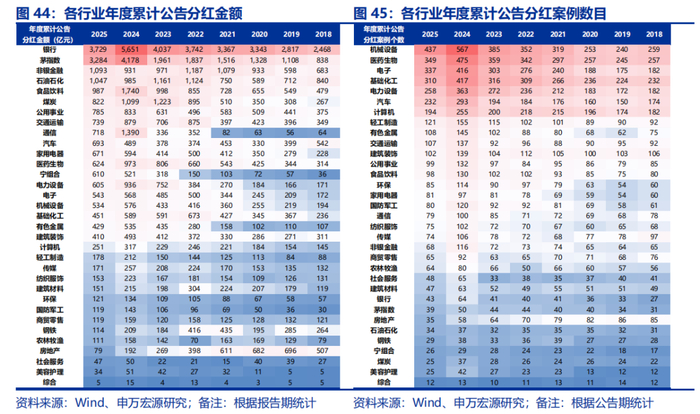 2024年,A股市场迎来了股东回报的显著提升,以现金分红和股份回购为代表的股东回报机制渐成风潮,反映出上市公司对投资者利益的重视和对企业长期价值的坚定承诺。在政策引导和市场环境的双重推动下,A股上市公司的分红规模创下历史新高,回购力度也大幅增长,形成了"高分红+强回购"的双轮驱动格局。2024年全年,A股已公告或实施的分红案件共4968次,分红总额达到2.16万亿元,创历史新高。其中,银行、食品饮料、通信为2024年分红总额前三大行业,规模分别达到5651亿元、1740亿元和1390亿元。另外,以龙头股作为主要成分的茅指数2024年全年分红金额达到4178亿元,相比2023年增长超过100%。而从公司分红数量来看,机械设备、医药生物、电子、基础化工、电力设备等成长类行业在2024年分红案例均超过300例。