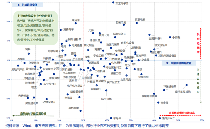 (2)供给边际变化分数(下图Y轴):首先分别计算出每个行业对应6大指标的初次处理值=某行业在A指标的边际变化/max(abs(不同行业在A指标的边际变化)),然后就初次处理后的各项指标进行加权求和,权重与以上一致,即,供给边际变化分数=30%*固定资产TTM处理值+15%*资本开支TTM同比处理值+15%*在建工程处理值+15%*资本开支占固定资产比重TTM处理值+15%*在建工程占固定资产比重处理值+10%*存货同处理值。这样做的好处是使得不同行业的边际变化程度具有可比性。分数大于0表示供给边际增加,小于0表示边际减少。具体可见2024年10月8日发布的《总量供给仍在消化中,科技硬件与出海制造格局占优——行业比较供需格局探讨专题》报告。