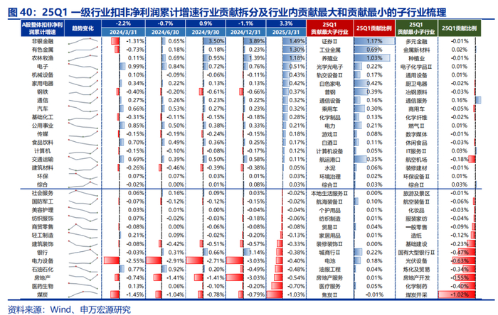 3.利润增速贡献拆分:非银、有色金属、农林牧渔、电子、机械设备为全体A股利润增速贡献前五大行业