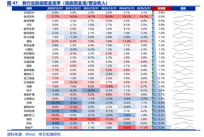 企业自由现金流率 = 企业自由现金流/营业收入,即每单位转化为自由现金流的效率,该指标越高意味着企业盈利质量更优、财务风险抵抗力强。筛选过去六年行业自由现金流率较为稳定(即标准差较小),且自由现金流率较高的典型行业有:食品饮料、通信、交通运输。
