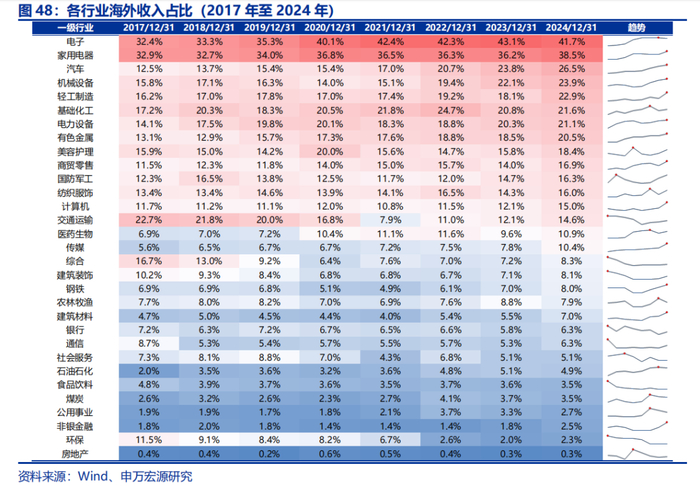 2024年A股海外营收占比续创新高,行业结构中,海外收入占比前五大行业分别为:电子(41.7%)>家用电器(38.5%)>汽车(26.5%)>机械设备(23.9%)>轻工制造(22.9%)。