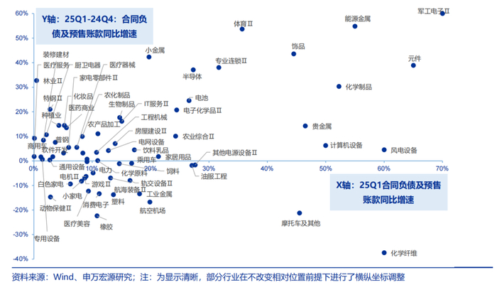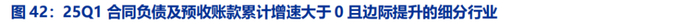 【需求】从财报视角展望后续,采用合同负债及预收账款的增速来对行业需求端进行前瞻。合同负债及预售账款往往是需求端的先行信号,它反映了企业已收款但尚未交付商品或服务的义务,其增长通常意味着下游需求旺盛,企业订单储备充足。若某行业合同负债同比大幅增长,可能预示未来1-2个季度收入加速释放。筛选25Q1合同负债及预收账款增速大于0且边际仍有提升的行业,主要有:军工电子(订单驱动特征明显,2025年随着“十四五”收官和“十五五”规划启动,新型装备列装加速,订单将逐步释放)、元件(主要系AI产业驱动,表明下游客户备货意愿强烈)、计算机设备(主要系AI服务器需求激增影响,算力基建订单旺盛)、半导体(半导体行业周期继续上行以及国产替代带来订单增加)、能源金属(价格触底,亏损企业产能出清,2025年供需格局改善,下游补库需求增加)、贵金属(黄金价格上行,推动贵金属投资需求,黄金企业预收款或合同负债增长)、饰品、化学制品(部分子行业景气回升,合同负债增长反映订单修复)、风电设备(风电装机需求回升,尤其是海风项目招标增加,推动风电设备企业合同负债增长)。这些行业的合同负债及预收账款增速提升,预示着2025年业绩有望持续改善,尤其是订单驱动型行业(军工、半导体、风电)和需求复苏领域(贵金属、能源金属)值得重点关注。