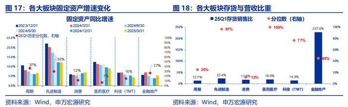 以在建工程来看,周期仍有一定转固压力,而先进制造仍处于连续负增长出清中。周期25Q1在建工程增速回落4.7个百分点至11.8%,处于历史77%分位,在建工程占固定资产比处于历史53%分位,未来转固压力相对较高。先进制造25Q1在建工程增速及其占固定资产比均继续下行,且都来到历史低位,在建工程短期转固压力缓解。