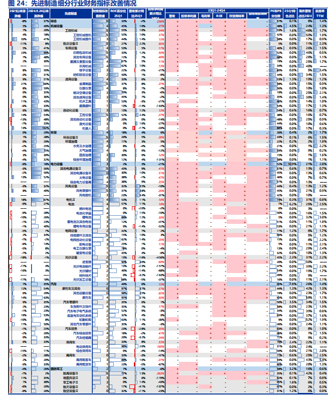 先进制造板块25Q1扣非净利润增速大于15%,且六大财务指标改善数量在4个及以上的行业有:工程机械、轨交设备、专用设备、环保设备、其他电源设备、电池、逆变器、摩托车及其他、航海装备,集中分布在高端装备出海、新能源技术迭代等领域。