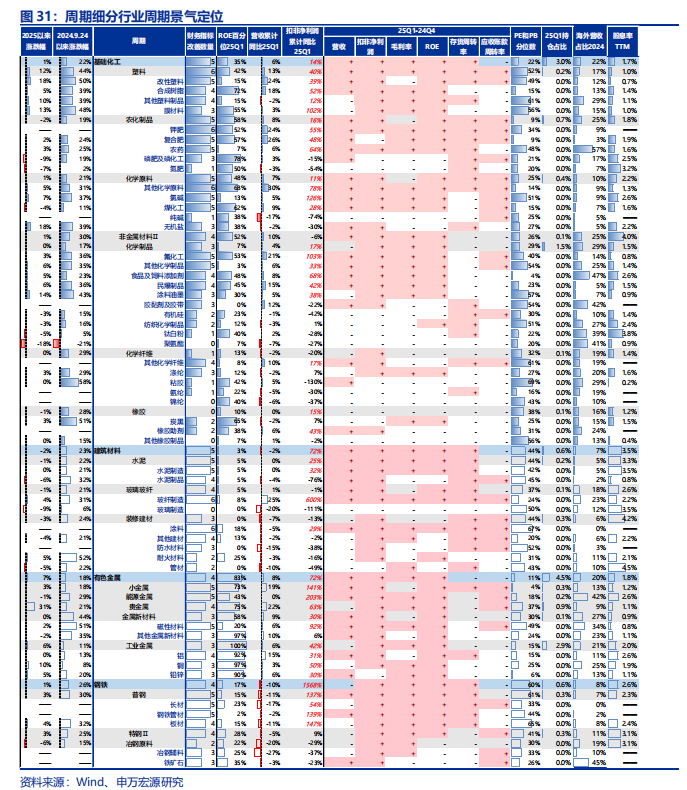 相对景气而言:25Q1重点财务指标改善数量在4个及以上且收入端和利润端均正增长的行业有:传媒、农林牧渔(扭亏)、基础化工、家用电器、计算机(亏损)、有色金属、机械设备、环保。