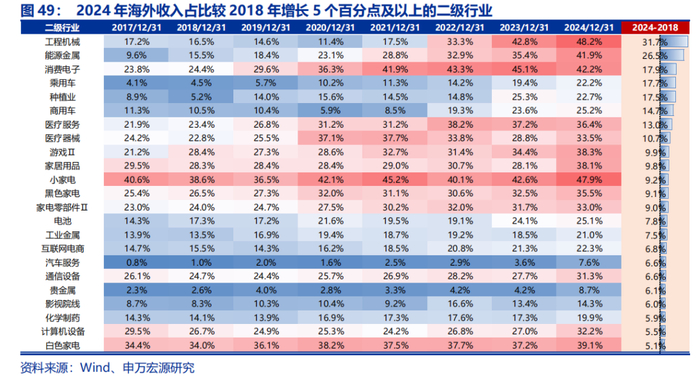 2024年A股海外营收占比续创新高,行业结构来看,中国中高端制造业与消费品制造全球比较优势突出,行业海外营收占比较大。2024年海外收入占比前五大行业分别为:电子(41.7%)>家用电器(38.5%)>汽车(26.5%)>机械设备(23.9%)>轻工制造(22.9%)。2024年海外收入占比相较上一次“贸易战”时期(即2018年)提升幅度在5个百分点以上的二级行业有23个,其中工程机械、能源金属、消费电子、乘用车、种植业为前五大行业,增幅分别达到31.7、26.5、17.9、17.7和17.5个百分点。