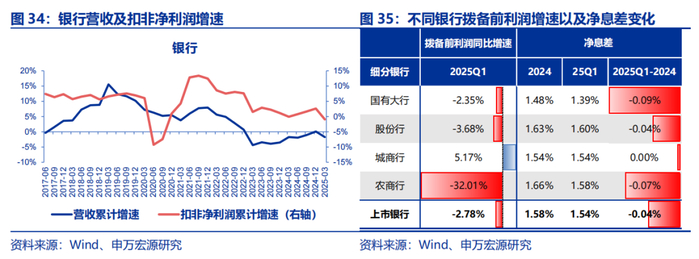 银行:营收和利润增速双双下滑,经营状况承压。25Q1银行营收和扣非净利润增速分别为-1.7%和-0.92%,分别较上个季度下行1.80和3.54个百分点。在利率下行的背景下,银行的净息差持续下行,25Q1上市银行净息差相比2024年底继续下行0.04个百分点,为目前的1.54%。同时,在经营压力下,银行多选择释放拨备应对,以波拨备前利润来看,25Q1只有城商行实现5.17%的增长,国有大行业、股份行、农商行分别较去年同期下行2.35、3.68和32.01个百分点。