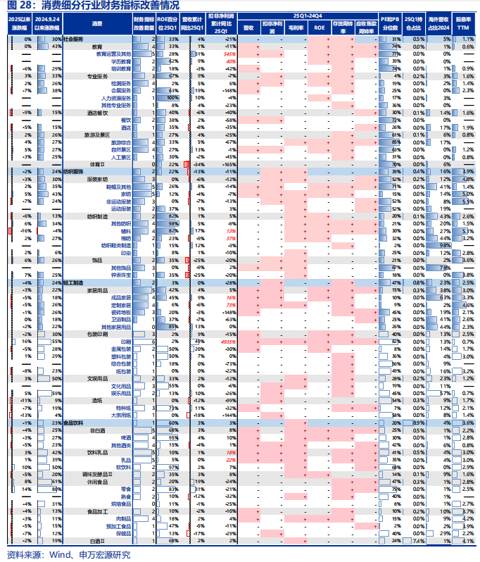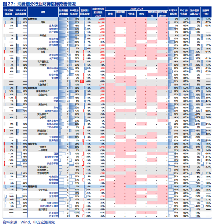 农林牧渔盈利能力大幅回升,其他消费承压。消费板块中25Q1改善了4个及以上财务指标且25Q1扣非净利润累计增速大于15%的行业有:饲料(受益于养殖存栏回升)、养殖业、动物保健、家电零部件、白色家电、贸易、个护用品、饮料乳品等。