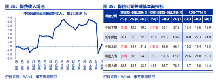 非银金融:证券受益于权益市场回暖,营收和利润增速双双回暖;保险在新会计准则下业绩呈现明显分化。证券:2025年一季度A股市场呈现出典型的以科技和小盘为主导的“春季躁动”行情,权益市场的回暖带动证券行业营收与利润增速双双上行,24Q4、25Q1证券业营收累计增速分别达到7.2%和24.6%,扣非净利润累计增速达到14.7%和54.0%。保险:由于险企2023年以来陆续执行新会计准则,使得企业利润和净资产波动剧烈,业绩明显分化,其中如中国人保、中国人寿、新华保险25Q1扣非净利润增速分别达到43.5%、39.3%和19.6%,ROE-TTM分别为16.7%、21.6%和34.0%,利润端增长主要系承保业绩以及投资业绩带来的贡献,而中国平安和中国太保25Q1扣非净利润累计增速则分别为-17.5%和-18.1%,主要系去年同期高基数影响以及交易性金融资产公允价值变动对净利润的影响。新准则的实施使得险企的净利润的可预期性变得更弱。