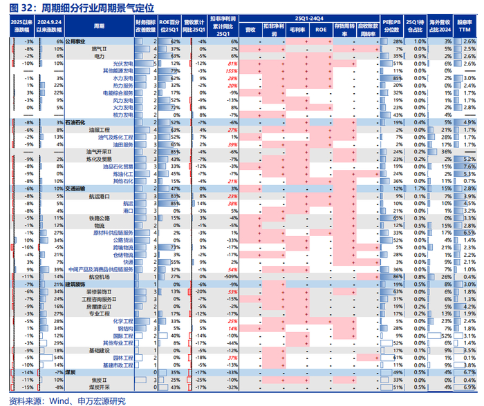 2025Q1A股整体扣非净利润累计增速为3.3%,进一步对A股利润增速进行贡献拆分,其中贡献为正的前五大行业分别为:非银金融(+1.49pct,主要受益于资本市场回暖)、有色金属(+1.30pct,受新能源金属价格触底反弹及工业金属供给收缩共振推动)、农林牧渔(+1.18pct,生猪养殖行业产能去化周期上行)、电子(+0.51pct)、机械设备(+0.43pct,AI算力硬件迭代周期及高端装备出海替代加速)。而相反的,拖累A股整体利润增速的前五大行业主要是:煤炭(-1.03pct)、医药生物(-0.70pct)、房地产(-0.54pct)、石油石化(-0.48pct)、电力设备(-0.40pct)。