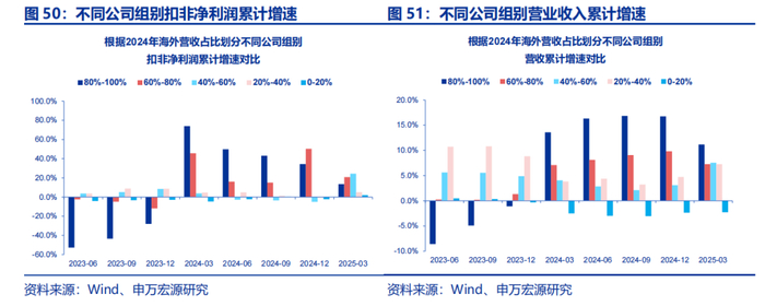 2025年一季度“抢出口”效应明显,出口链公司业绩延续占优,但趋势放缓。内需类公司绝对业绩偏弱,但边际改善。展望后续,内外需动能切换正在酝酿中。海外营收占比(2024年)在80%-100%的公司组别25Q1收入端实现11.2%的同比增速,而海外营收占比为0-20%组别的公司25Q1营收增速仅为-2.3%,但边际变化上出口链公司收入增速较上个季度开始回落,而内需类公司增速开始改善。而利润端,海外营收占比(2024年)在80%-100%的公司组别25Q1利润端实现-12.8%的同比增速(主要系百利天恒影响,剔除掉单个公司后利润端增速为13.5%),而海外营收占比为0-20%组别的公司25Q1利润增速仅为2.0%,但同样出口链和内需类公司利润增速边际变化呈相反状态。