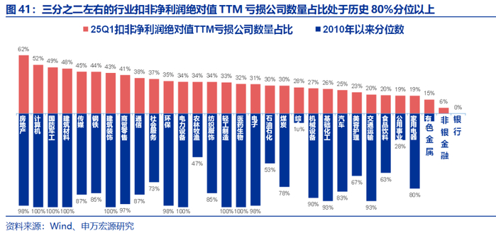 三分之二左右的行业利润绝对值亏损公司数量占比位于历史80%分位以上,反映宏观弱复苏背景下企业盈利韧性不足。进一步梳理各行业中25Q1扣非净利润绝对值TTM亏损的公司数量占比,其中三分之二左右的行业当前占比处于2010年以来80%分位以上。25Q1除银行外的其余所有行业中均有公司亏损,按亏损公司占比从大到小,前五大行业为:房地产(62%)>计算机(52%)>国防军工(49%)>建筑材料(48%)>传媒(45%)。