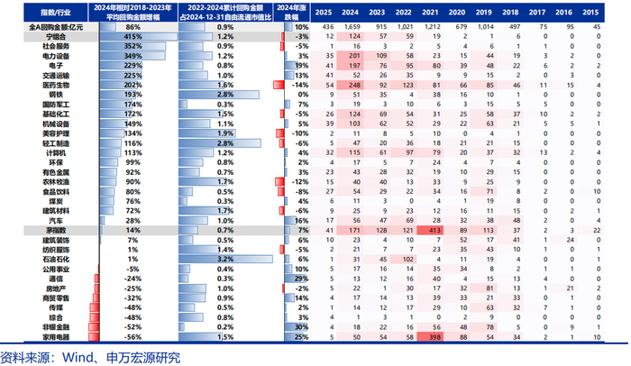 除分红外,港股和A股市场,回购规模持续上行。2024年全年港股有281家公司回购股份,累计回购金额达2665亿港元,若不包含腾讯控股,仍有1545亿港元规模的回购,较2023年全年的771亿港元增幅超过100%。同期A股有2156家A股公司回购股份,累计金额1659亿元,相比2023年全年回购金额提升81.3%。分行业来看,医药、电子、电力设备、基础化工、机械设备和计算机为2024年回购规模超100亿元的几大行业。展望未来,在引导长期资金入市的背景下,预计管理层将继续引导和优化股东分红和回报政策,促进中国资本市场健康可持续发展。