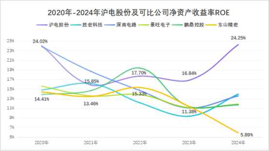 纵向对比来看,2024年沪电股份为24.25%,跟2023年相比提升了近八个百分点。横向对比来看,同期鹏鼎控股、胜宏科技的ROE数值尚不足15%,与公司有着不小差距。