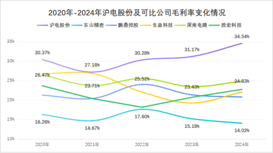沪电股份的毛利率常年位居行业第一,明显高于深南电路、鹏鼎控股、东山精密等对手。不仅如此,2022-2024年公司毛利率从30.28%攀升至34.54%,领先幅度还在持续扩大。